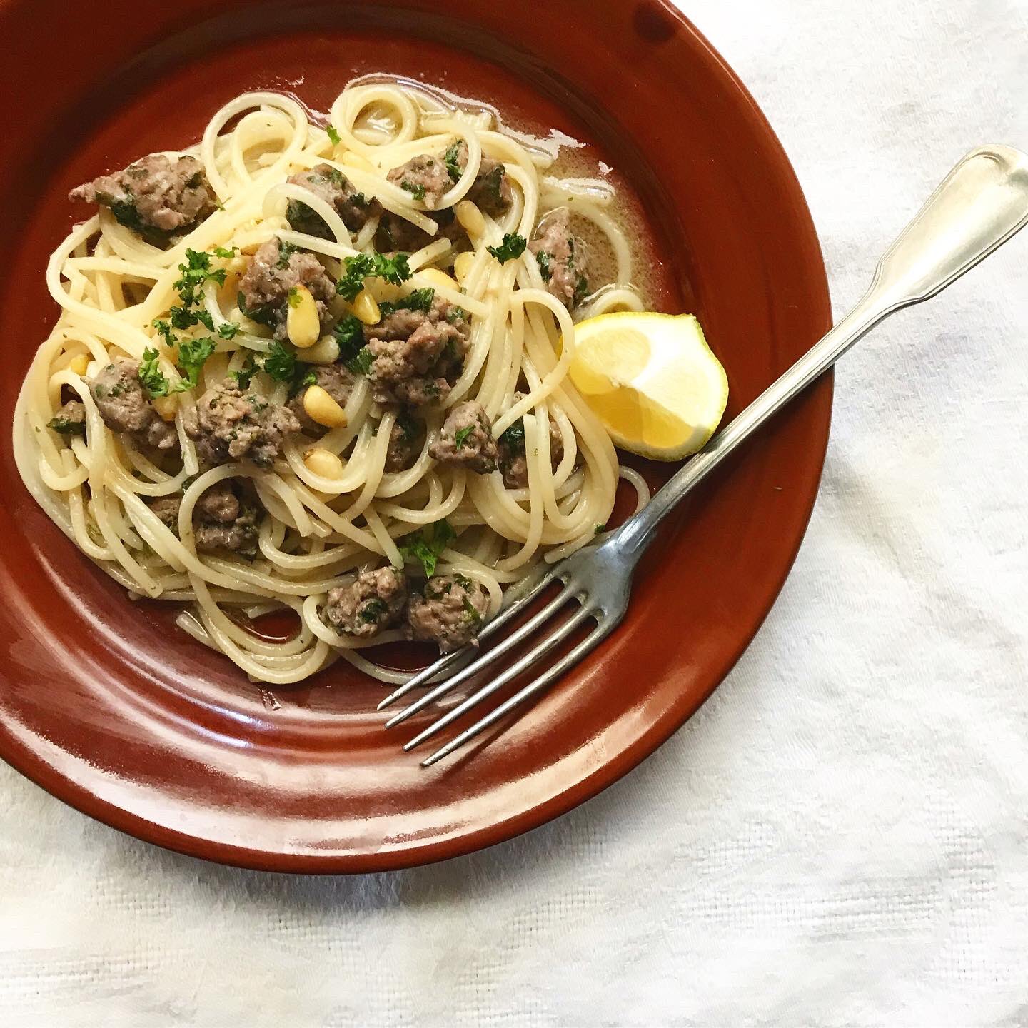 さなえごはん パセリとコリアンダーのサルシッチャパスタ レモンバターソース 挽肉に塩とたっぷりパセリ コリアンダーパウダーで粘るまで混ぜ 小さくちぎりつつオリーブオイルひいたフライパンへ 色が変わってきたらバター 溶けてきたらレモン汁と松の実